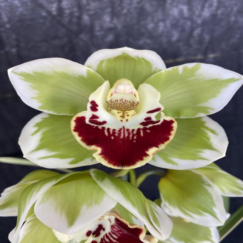 A rare opportunity to purchase a fantastic and popular awarded feathered cymbidium of the highest quality. A very large green standard with bold red lips and attractive white feathering on the petals and sepals. Foliage is also variegated. Easy to grow and bloom. Near blooming size bulb and new growth division in a gallon pot.