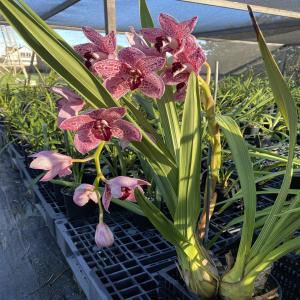 This is the first release of this plant. It is a very large standard red cymbidium on a gracefully arching spike. Flowers or heavily spotted, and lip is bold burgundy. Near blooming size division in a gallon pot.