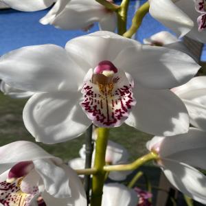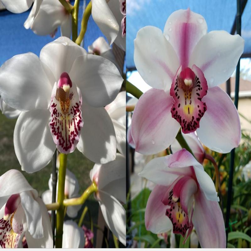 This is hybrid between two beautiful large white standards. Joan’s Charisma is the whitest cymbidium I own, which combined with the beautiful Venetian Interlude should produce some very fine whites. Spikes should be upright with good flower count. Near blooming size seedlings in gallon pots.