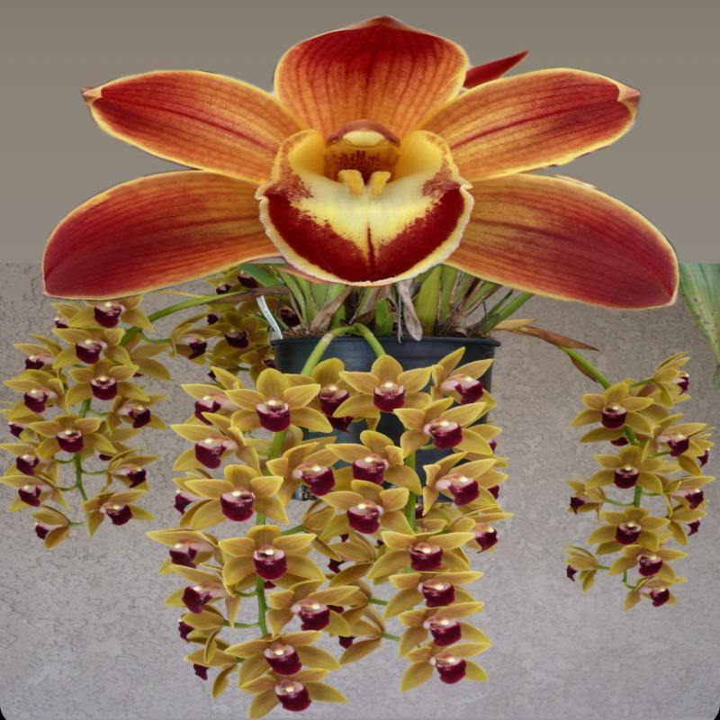 This is a hybrid between a very nice pendulous cymbidium and the famous Wallacia ‘Burnt Gold’. We hope to get arching to pendulous cymbidiums with red highlights and bold lips. Near blooming size seedlings in gallon pots.