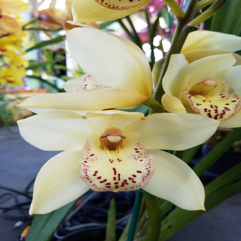 A very nice cream colored novelty cymbidium with a delicately spotted lip. This is one of the few cream colored from the hybrid of Via Ambarino with Eastern Bunny. Near blooming size division in a gallon pot.