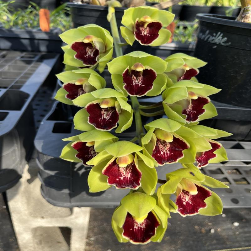 This is the second release of a division of this plant. It has nice clean green flowers with bold red lips on arching to pendulous spikes. Near blooming size division in a gallon pot.