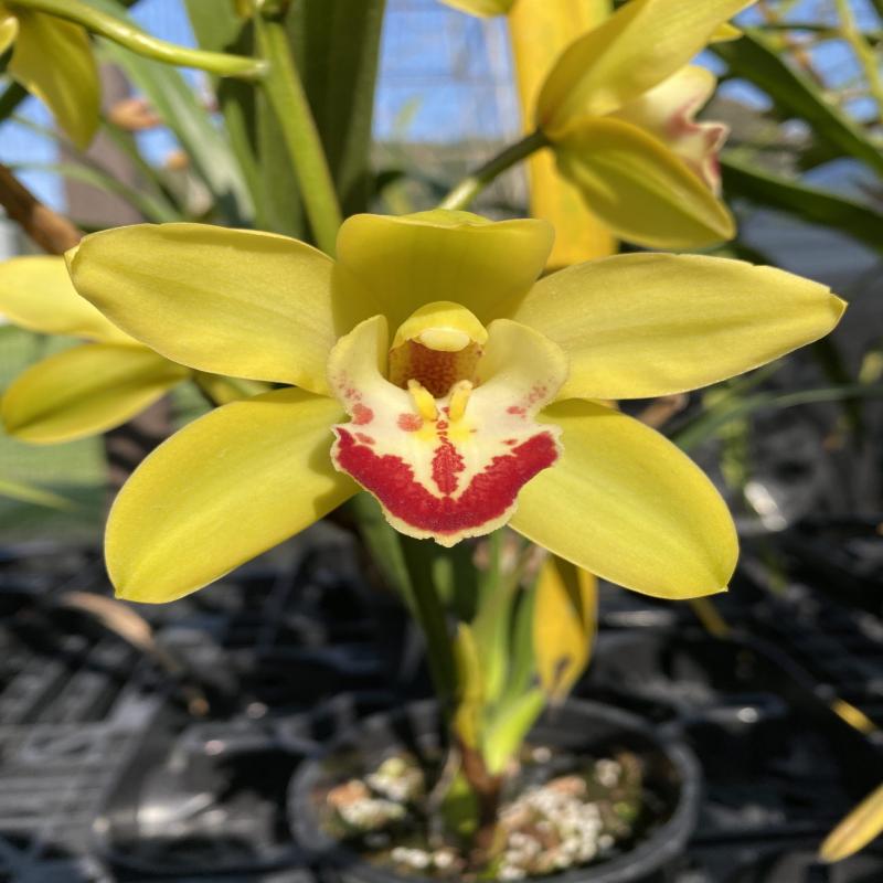 Bright yellow novelty flowers on upright spikes with a bright red lip. An easy grower that is free flowering with great color. Mother plant. Near blooming size division in a gallon pot.