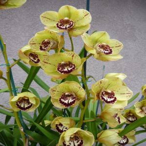 A very large round light green flower on an upright to arching spike. Flowers are massive with very wide segments. The spike is weak and needs to be trained or it will arch over in a pendant presentation. Near blooming size division in a gallon pot.