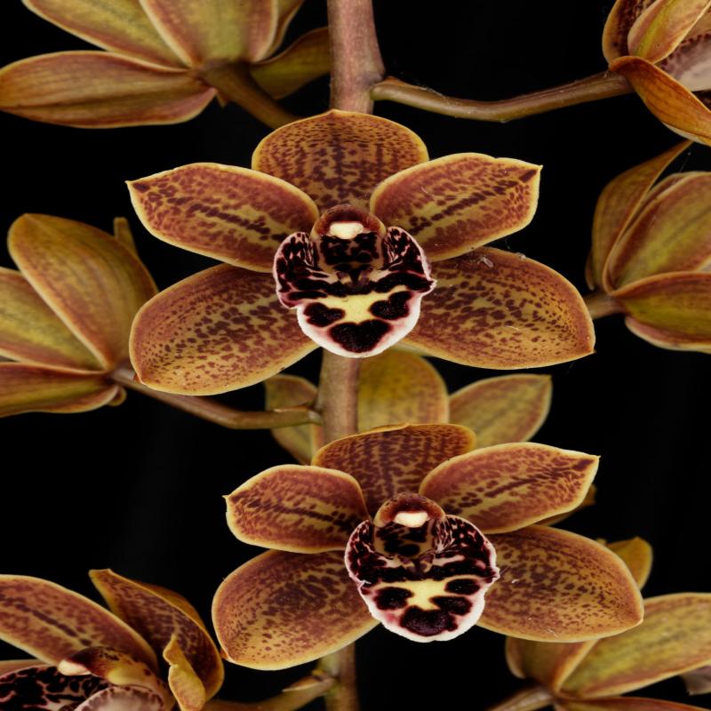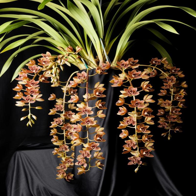 This is the third release of a division of this plant. It is an outstanding grower and bloomer. Long pendulous spikes of brown/polychrome flowers with excellent form and presentation, and very floriferous. Being a primary suave hybrid, this plant has multiple spikes per bulb and can also bloom off old bulbs. Near blooming size division in a gallon pot.