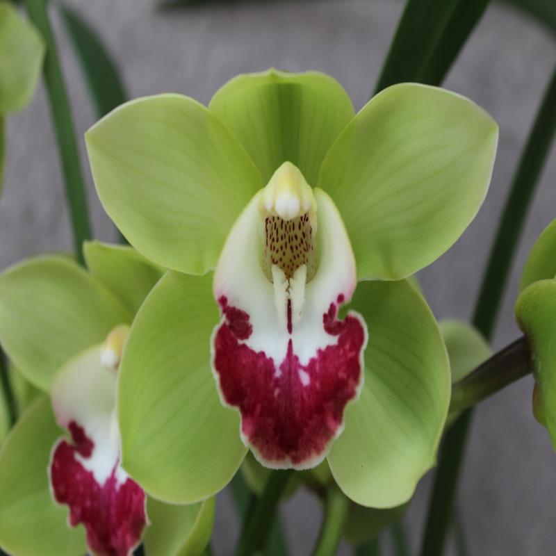 A very clean green flower with bold red lips on tall upright spikes. Near blooming size division in a gallon pot.