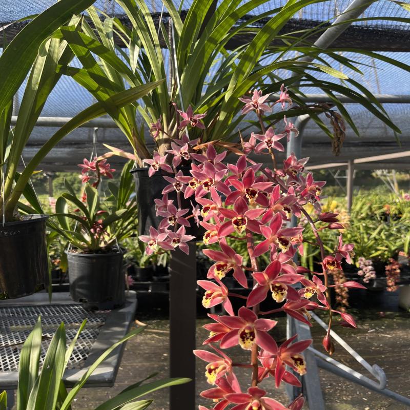 A very charming pink pendulous cymbidium with a light sweet fragrance. A suave hybrid that is popular among enthusiasts. A very floriferous bloomer on old and new bulbs. Near blooming size division in a gallon pot.