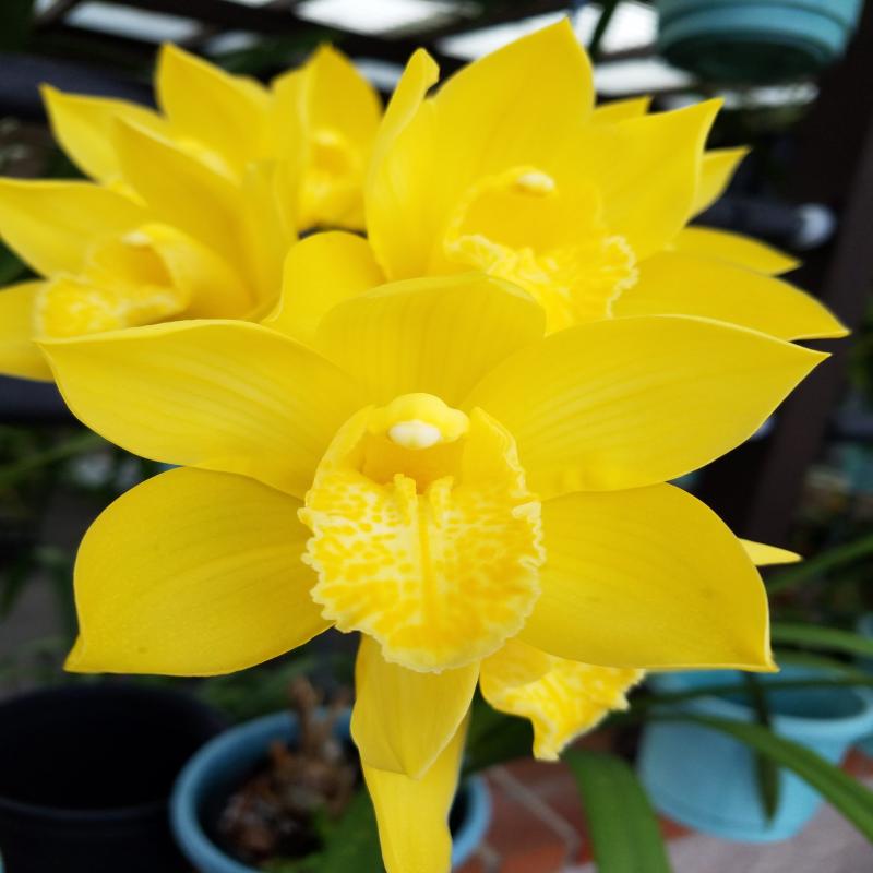 This is a very tall and bright alba yellow cymbidium on very upright spikes, well above the foliage. The color is spectacular. Small standard flowers. Near blooming size division in a gallon pot.
