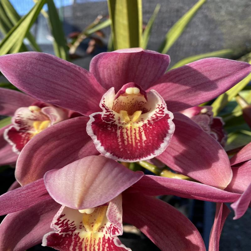 A nice standard dark pastel pink cymbidium with a red lip. Near blooming size division in a gallon pot.