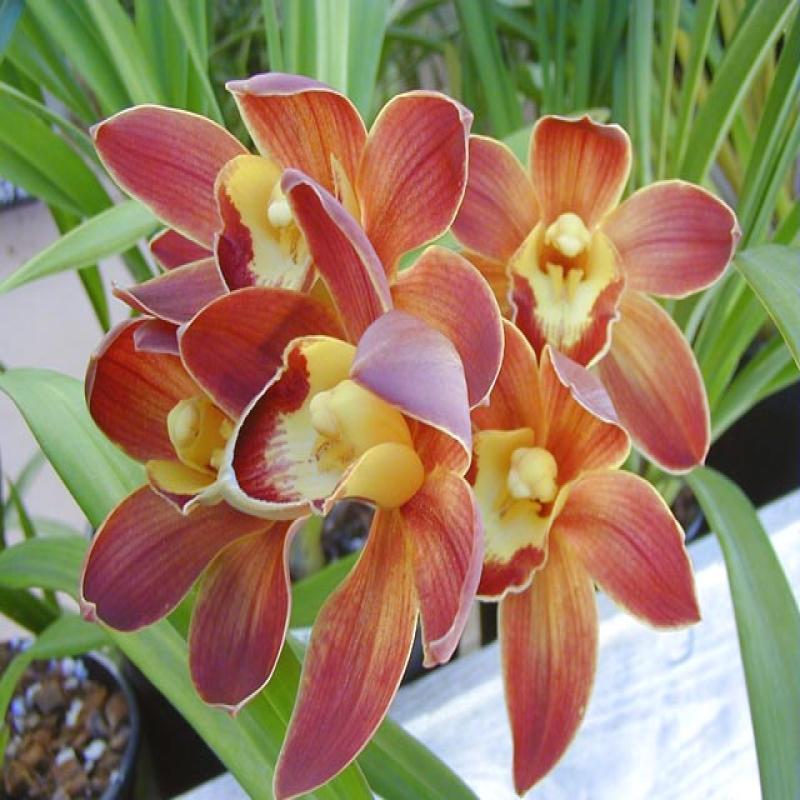 The famous yellow cymbidium with red splash marks on all segments. Near blooming size division in a gallon pot.