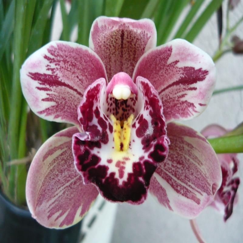 A fantastic purple novelty cymbidium with white feathering on upright to arching spikes. Excellent contrast. Division of the Mother plant. Blooming size division in a gallon pot.