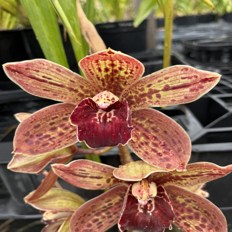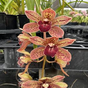 This is a very nice spotted standard cymbidium on upright arching spikes. Near blooming size division in a gallon pot.