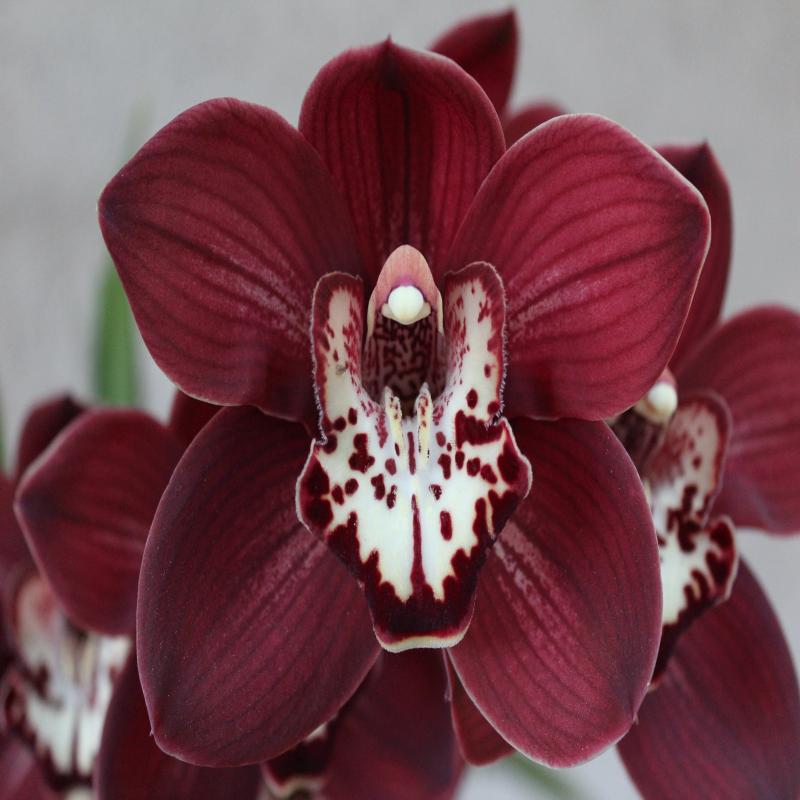 A very nicely formed large and round dark red standard cymbidium on upright spikes. Near blooming size division in a gallon pot. Limited Release.