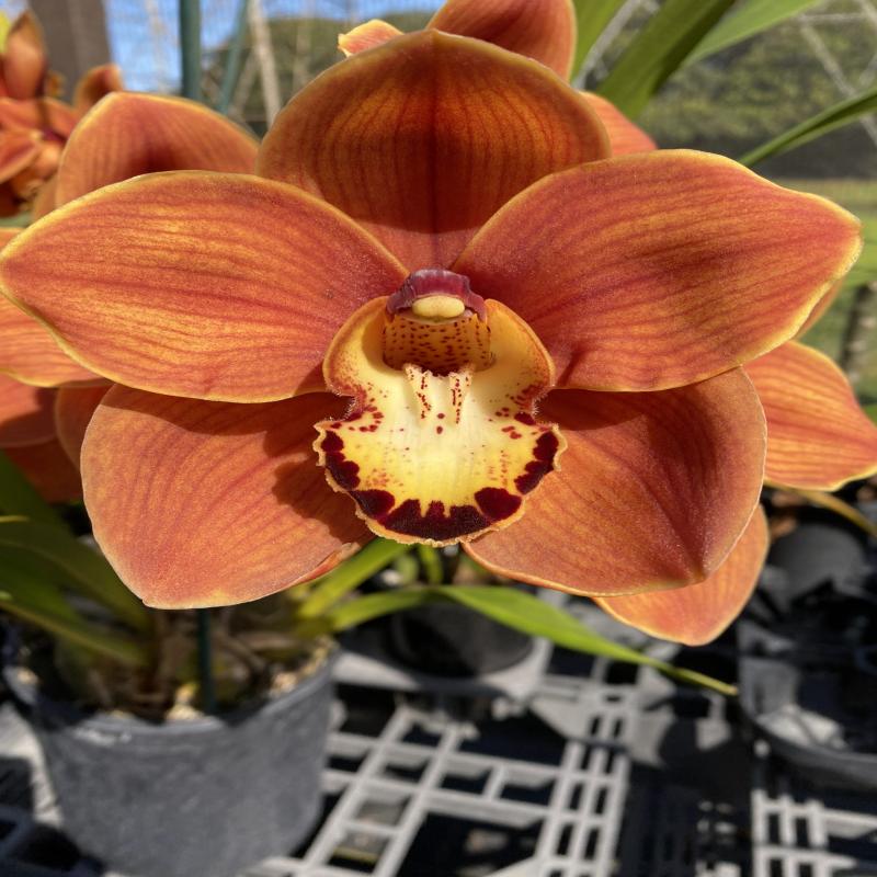 A large and flat full-formed orange flower on short spikes. The flowers are large and good substance. Near blooming size division in a gallon pot.