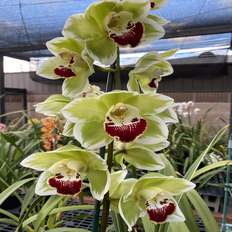 A rare opportunity to purchase a fantastic and popular awarded feathered cymbidium of the highest quality. A very large green standard with bold red lips and attractive white feathering on the petals and sepals. Foliage is also variegated. Easy to grow and bloom. Near blooming size bulb and new growth division in a gallon pot.