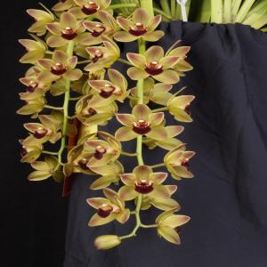 This is the first release of a division of this extraordinary plant. Highly awarded at the Santa Barbara International orchid show. It is a novelty cymbidium with lovely pendulous inflorescences with nice red highlighting on the petals. Very good form, substance and very floriferous. Near blooming size division in a gallon pot.