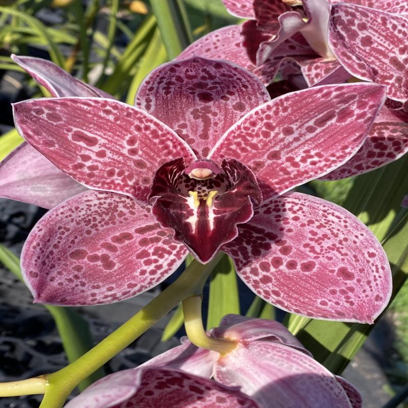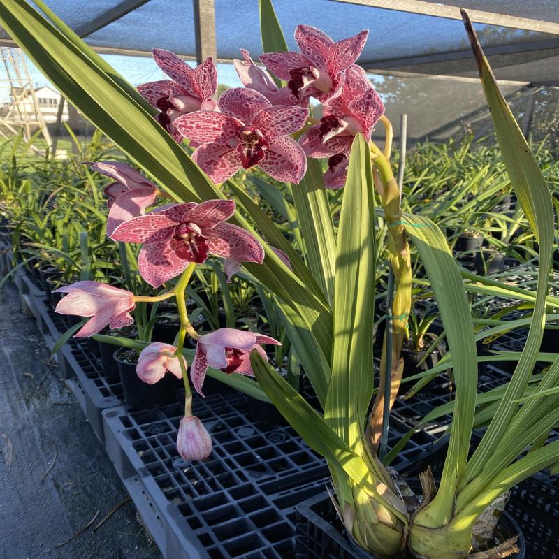 This is the first release of this plant. It is a very large standard red cymbidium on a gracefully arching spike. Flowers or heavily spotted, and lip is bold burgundy. Near blooming size division in a gallon pot.