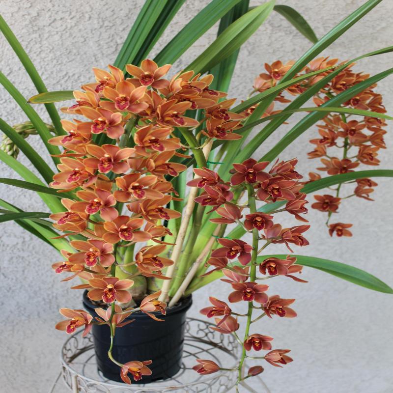 A very nice fragrant orange novelty cymbidium on long arching spikes. Very floriferous. Grows large and blooms freely. This is a division of the original awarded plant and not a meristem. Near blooming size division in a gallon pot.