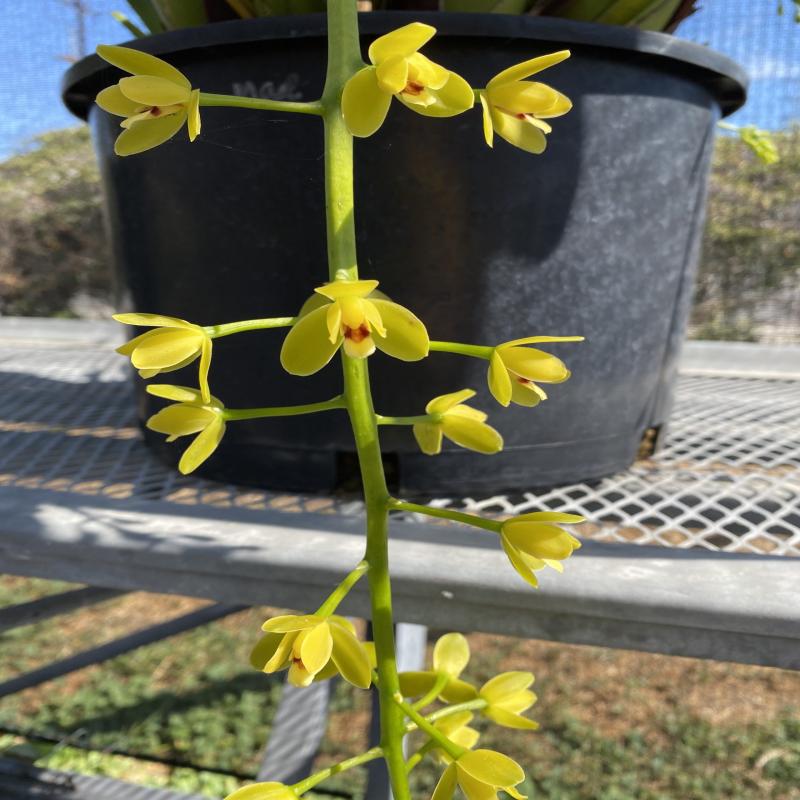 A very good growing green variety of cymbidium madidum. Fragrant species with a pendulous inflorescence. Near blooming size division in a gallon pot.