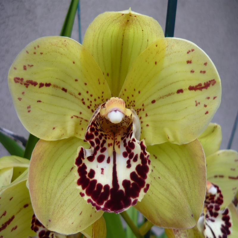A very large round light green flower on an upright to arching spike. Flowers are massive with very wide segments. The spike is weak and needs to be trained or it will arch over in a pendant presentation. Near blooming size division in a gallon pot.