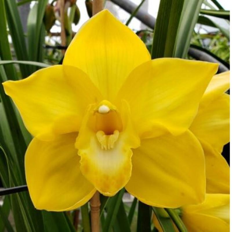 Very large alba yellow cymbidium from Bryant’s Orchids in Australia. Blooming size division in a gallon pot.