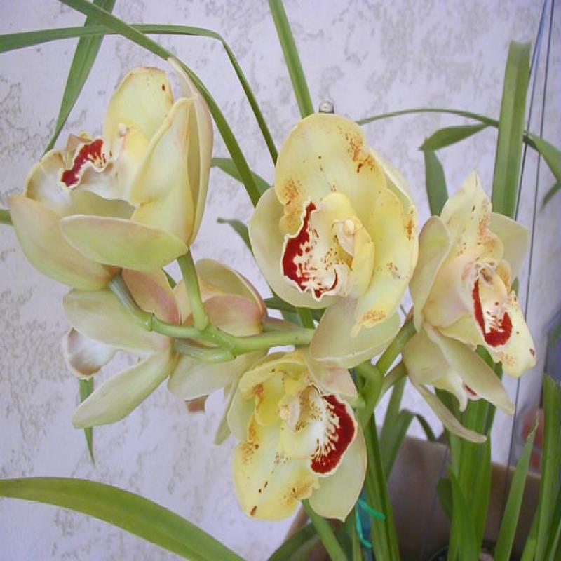 Light yellow petal peloric flowers on upright spikes. Mother plant. Near blooming size division in a gallon pot.