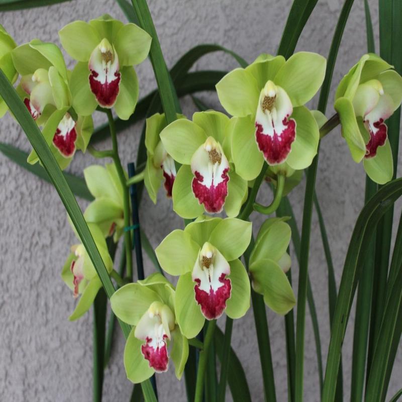 A very clean green flower with bold red lips on tall upright spikes. Near blooming size division in a gallon pot.