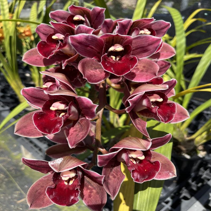 This is the first division to be released of this exceptional plant. It is a red Standard cymbidium with a bold velvety red lip and good flower count on an arching spike. Near Blooming size division in a gallon pot.