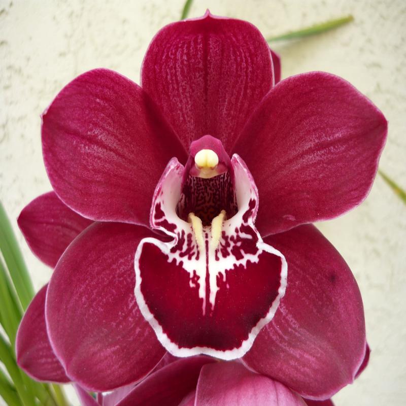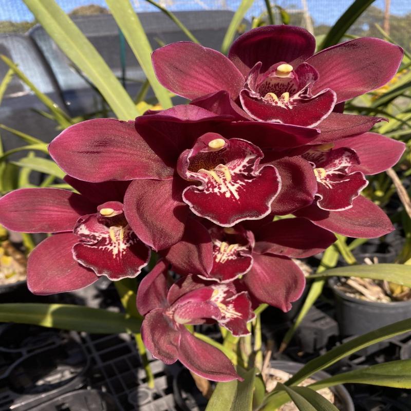 A very dark and intensely saturated wine-red flower with good form and a bold red lip edged in light pink/white. Division of the mother plant. Near blooming size division in a gallon pot.