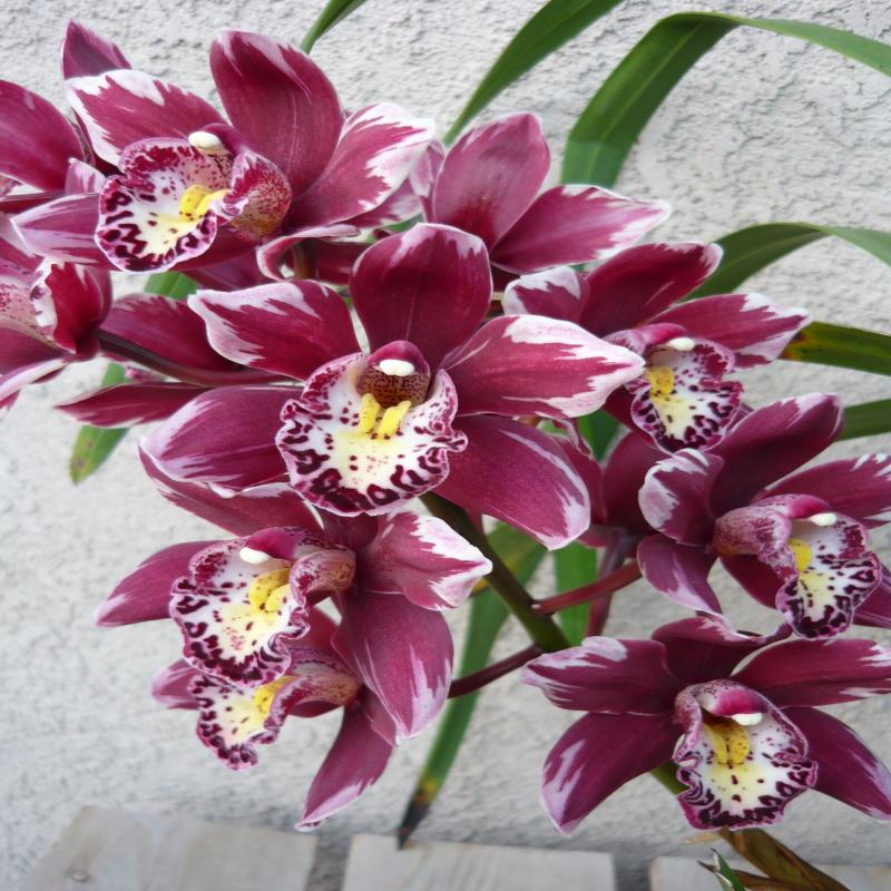 A fantastic red novelty cymbidium with white feathering on upright to arching spikes. Excellent contrast. Division of the Mother plant. Near blooming size division in a gallon pot.
